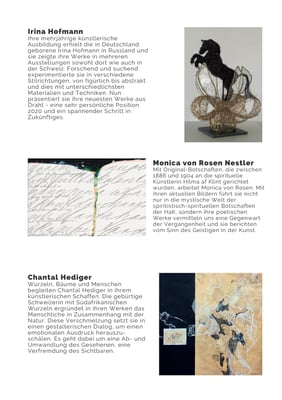 ruhend, harmonieren die Bilder vonRosalba ArcillaSchweizerin mit spanischen Wurzeln (Technik: Acryl auf Acrylglas, gemalt, gefräst) sowie die Objekte vonIvan Cortazaraus Mexiko (Drahtobjekte,